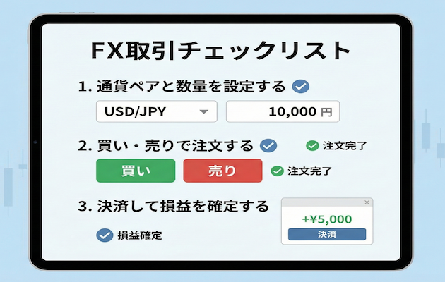 FX取引は通貨ペアと数量を決め買いか売りで注文し、決済して損益を確定する流れで進みます。あらかじめ手順を理解しておくことで操作ミスを防ぎ、初心者でも落ち着いて取引しやすくなります。