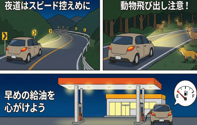 街灯が少ない区間は、路面の段差や落石も見落としがちです。歩行者や自転車が見えにくい道ほど、速度を落として余裕をもって運転しましょう。